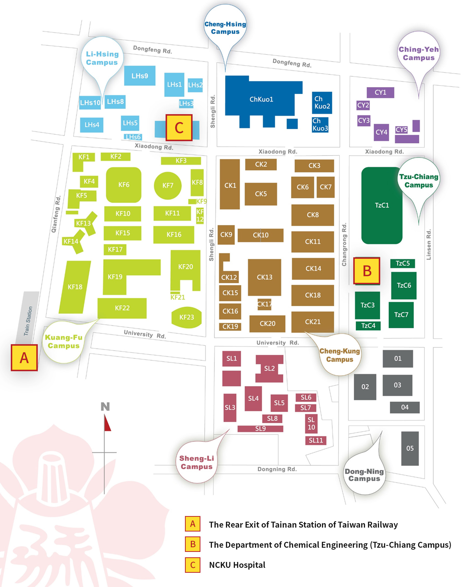 NCKU is located on University Road ( Ta-Shueh Road ) about 100m from the rear exit of Tainan Station of Taiwan Railway.